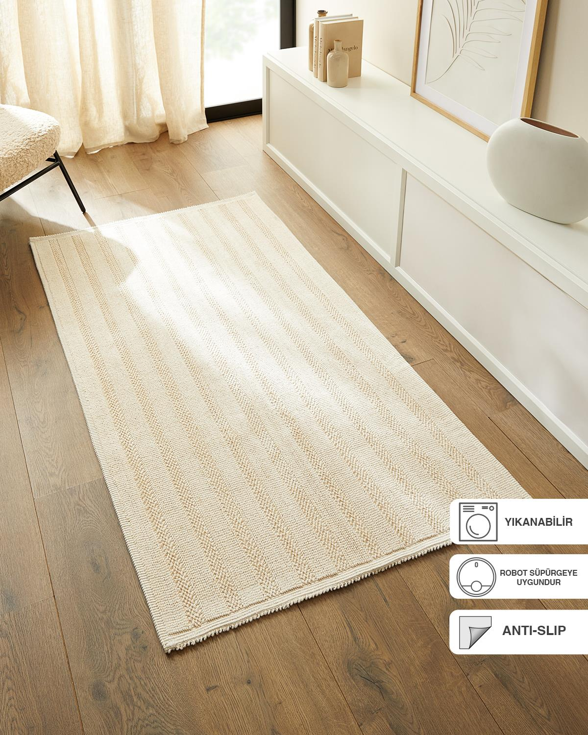 Geri dönüştürülmüş pamuklu ipliklerle üretilen yıkanabilir kilimlerimiz, sürdürülebilirliği ön planda tutarak evlerinize şıklık ve zarafet katmak amacıyla tasarlanmıştır.